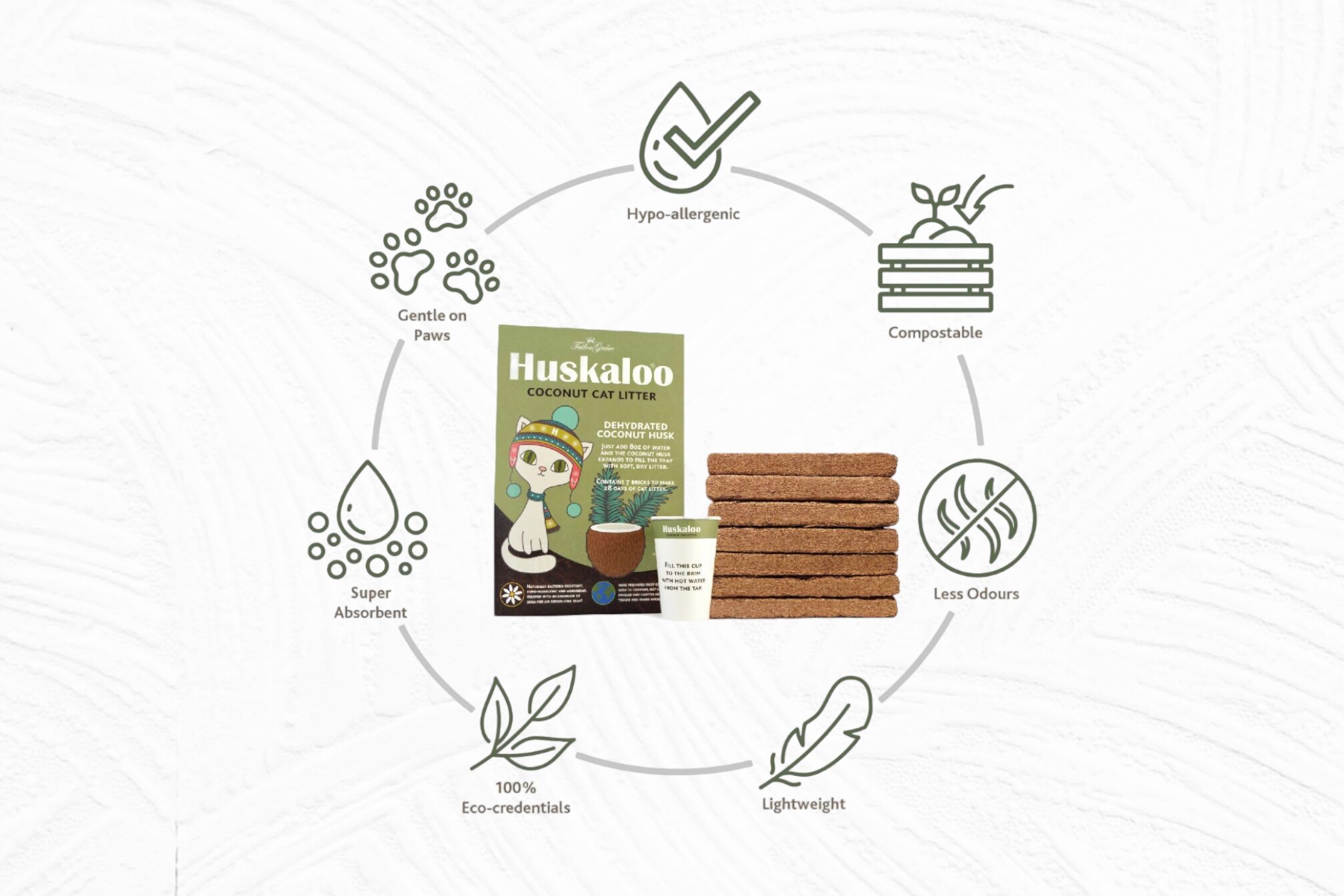 Huskaloo is a pressed stone made from dehydrated coconut husk. This is a natural by-product of coconuts that would otherwise just be thrown away. 90% smaller and lighter than clay cat litter, Huskaloo is also cheaper and greener to store and transport. 1 box is the size of a box of cereal, contains 8 “stones” , enough supply for 2 months for 1 cat. Coconut husk is improbably absorbent, naturally hypoallergenic and naturally resistant to bacteria. Contains no dust and is much softer on the paws. Huskaloo is compostable and biodegradable. The entire packaging is recyclable. Nothing has to go to the landfill. So it’s lighter, greener, cheaper and more absorbent.