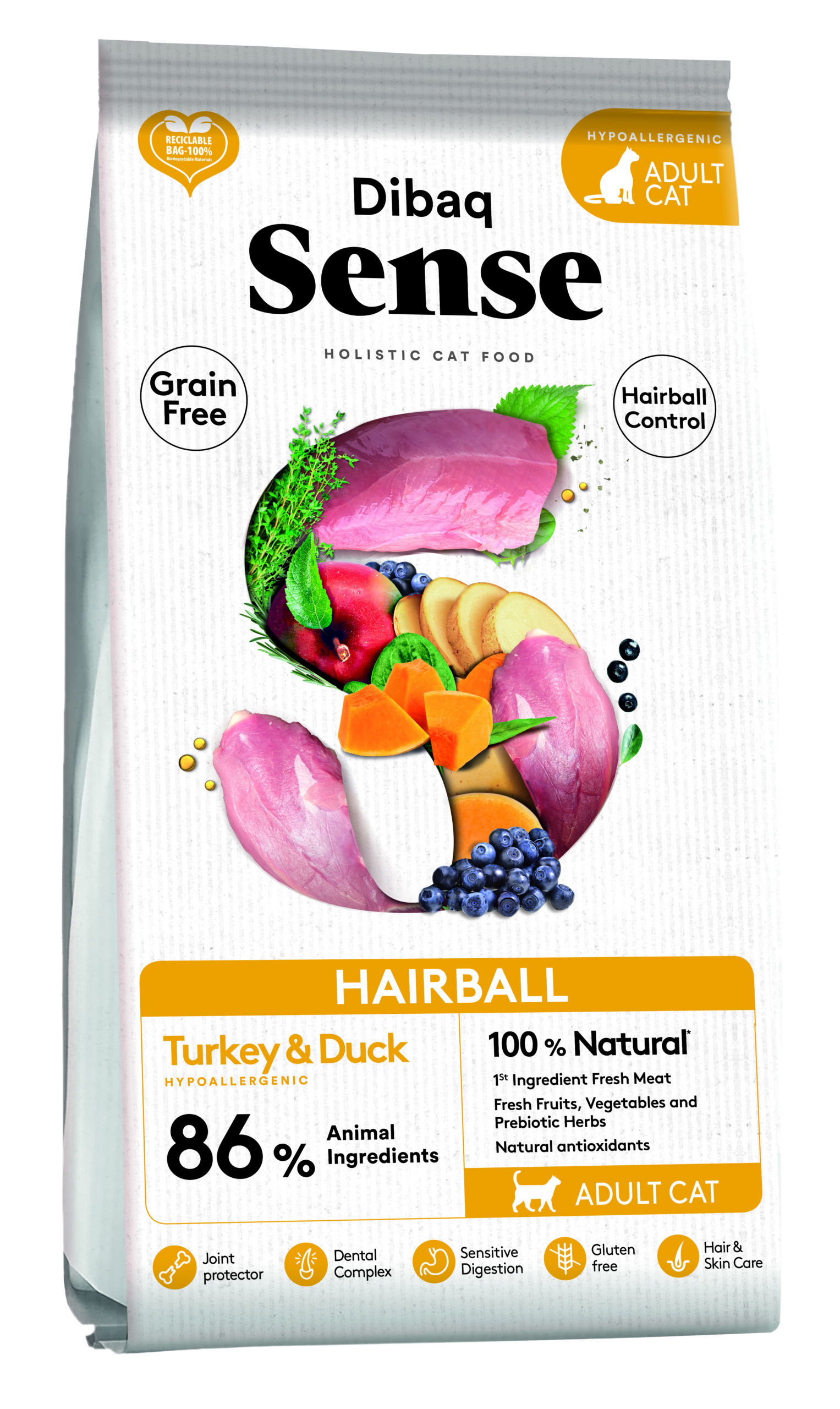 Dibaq Sense grain-free cat food hairball is the ideal food for your best friend, no grains, no soya, fresh meat prepared at a low temperature and 100% natural. it also contains salmon oil for the coat and chondriotine and glucosamine for strong and supple joints.